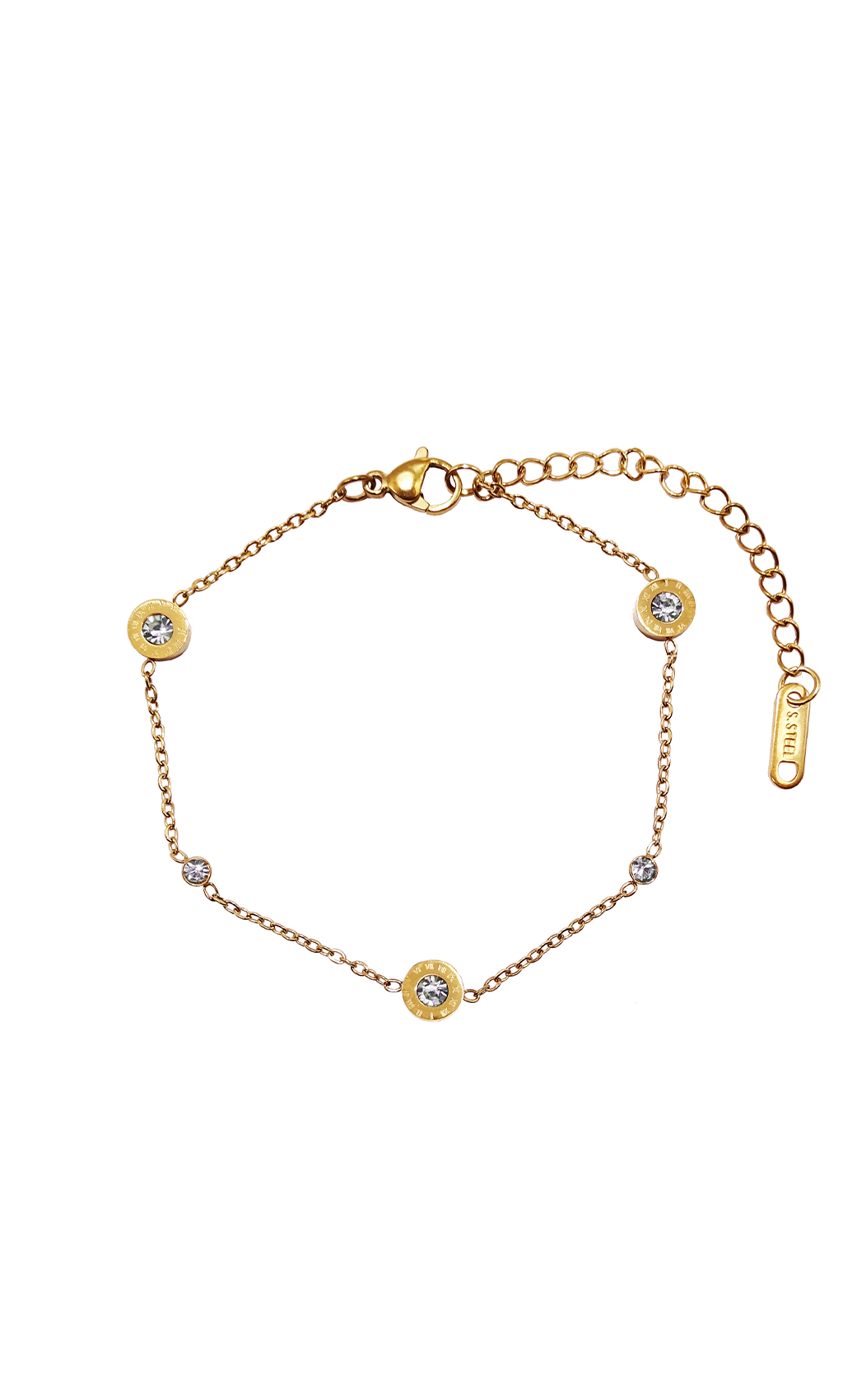 FLAVIA vereint römische Eleganz mit modernem Minimalismus. Feine Gliederketten tragen funkelnde Kristallfassungen, die bei jeder Bewegung das Licht einfangen. Verstellbar, zeitlos und vielseitig kombinierbar. Ein Armband, das jeden Look mit goldener Leichtigkeit veredelt.