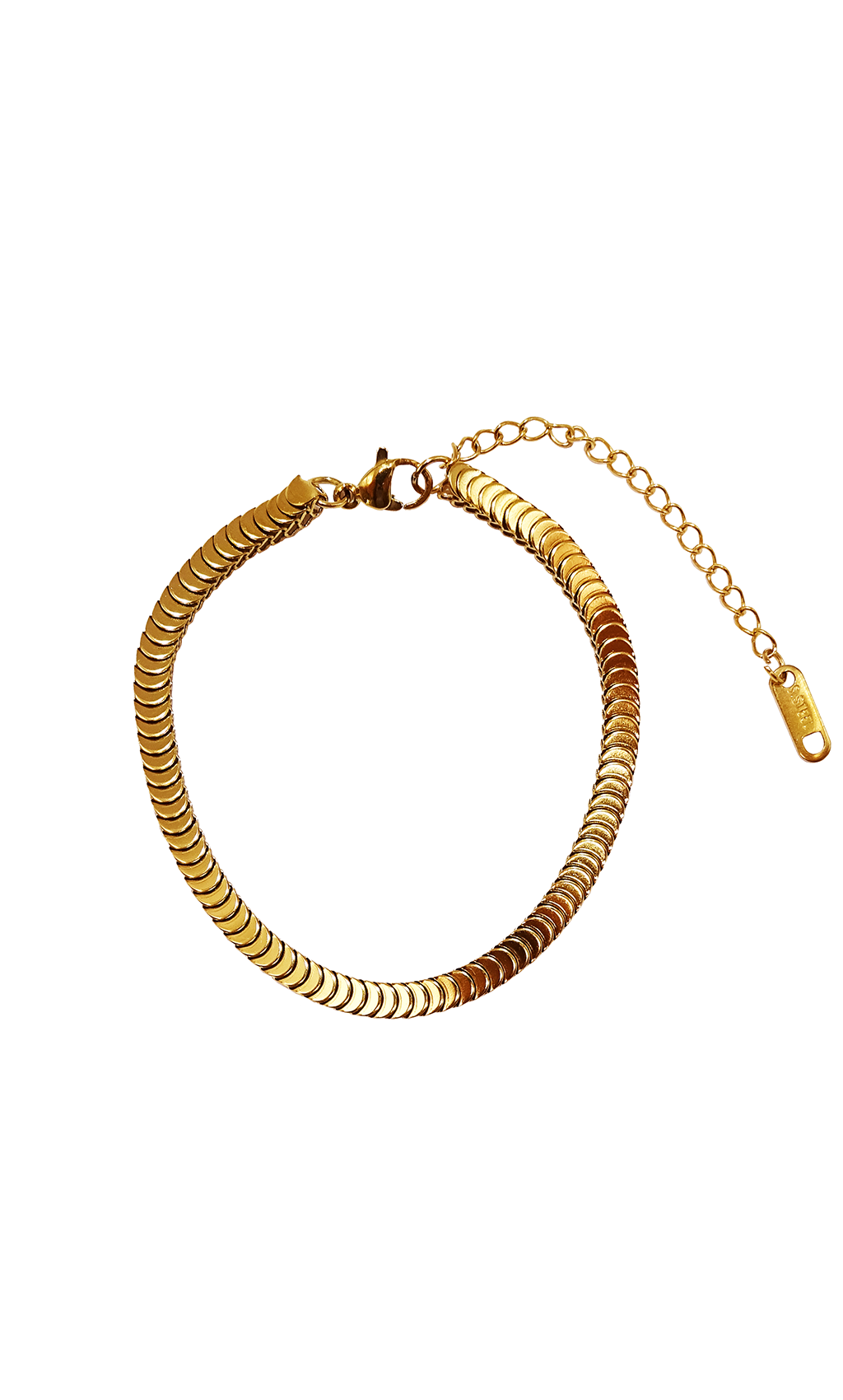 NOVA FLOW vereint minimalistisches Design mit fließender Bewegung. Die eng aneinanderliegenden, goldenen Scheiben legen sich wie eine sanfte Welle um dein Handgelenk und reflektieren das Licht bei jeder Bewegung. Ob allein getragen oder kombiniert mit anderen Armbändern. NOVA FLOW ist ein dezentes Statement für alle, die klare Linien und sanften Luxus lieben.